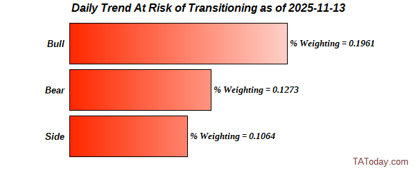 When viewed in context of price, one can get a sense of whether a move higher in price is supported by a move higher in bullishly trending stocks - or not. Same on bearishly trending stocks and declining prices. Additionally, we look forward with a "risk of transition" bar chart indicating the cumulative weight of stocks that are at risk of changing trend either up or down.