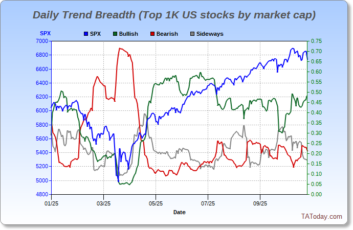 Most breadth measures are centered on advancing versus declining issues over some period of time. While useful, what is more useful is to know how many issues are bullish, bearish or sideways. This gives a measure of the trend breadth of a market. If we weight these stocks based on market cap and carry that weighting into trend, the we can derive a weighted measure of trend versus a simple count of trend.
