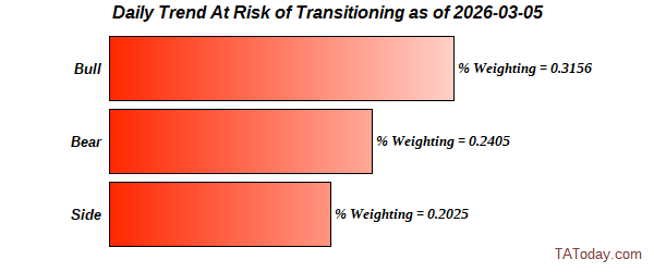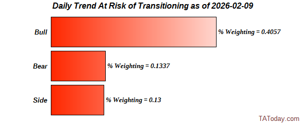When viewed in context of price, one can get a sense of whether a move higher in price is supported by a move higher in bullishly trending stocks - or not. Same on bearishly trending stocks and declining prices. Additionally, we look forward with a "risk of transition" bar chart indicating the cumulative weight of stocks that are at risk of changing trend either up or down.