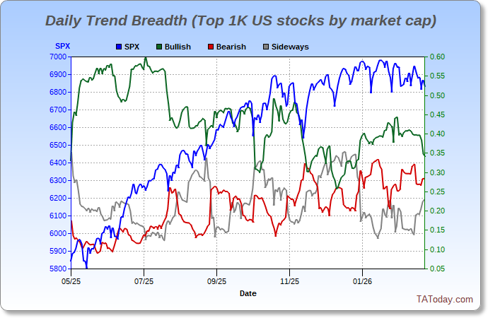 The charts below are for daily and weekly trend breadth weighted by market capitalization. Raw counts can be found here.
